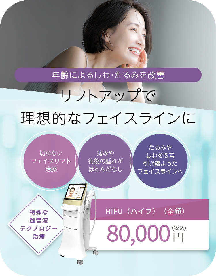 特殊な超音波テクノロジーを利用したマシン治療です。超音波の熱エネルギーを利用し、しわやたるみ、二重顎などを改善していきます。